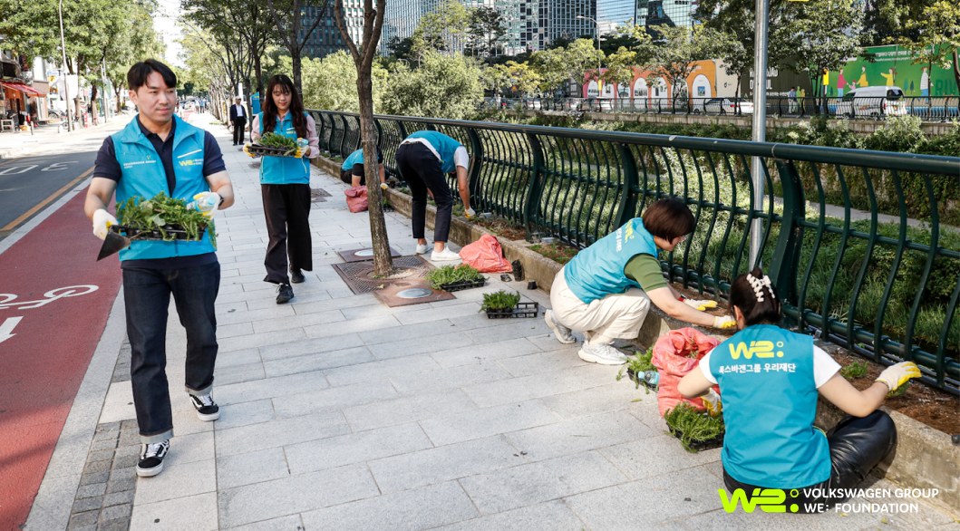 이에 폭스바겐그룹 우리재단은 지난 8월, 서울시설공단에 벽걸이 화분을 기부하여 모전교에서 광통교 구간의 벽을 가꾸는 활동을 진행했다. 이어 이번에 폭스바겐그룹코리아 임직원 50여명과 함께 광통교에서 장통교에 이르는 청계천 일대의 띠녹지대에 다양한 꽃을 심는 환경정비 활동에 참여했다.